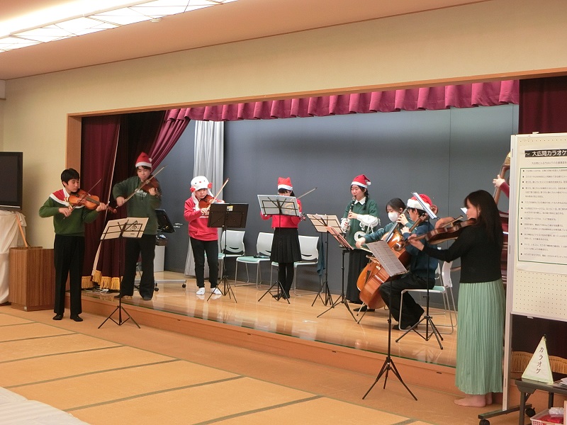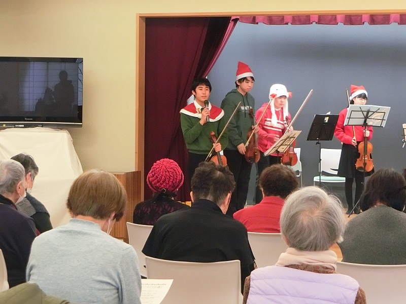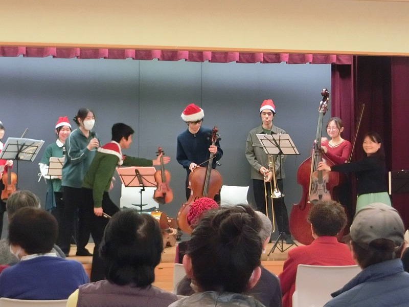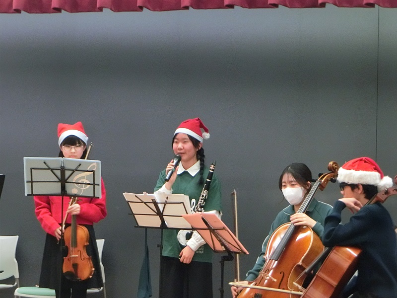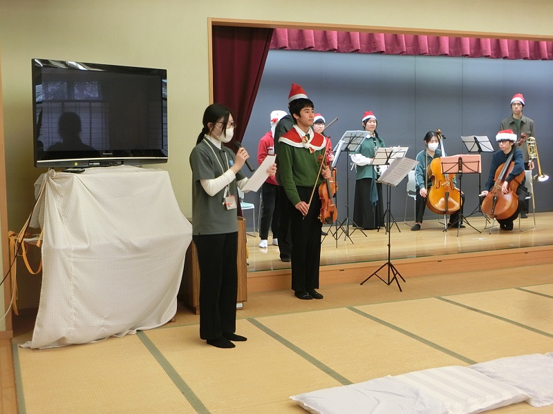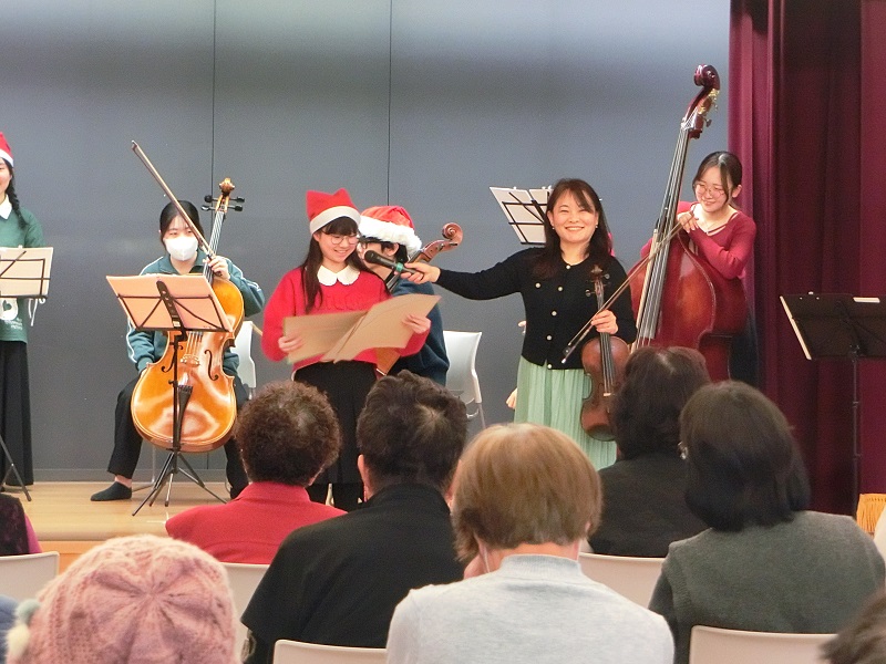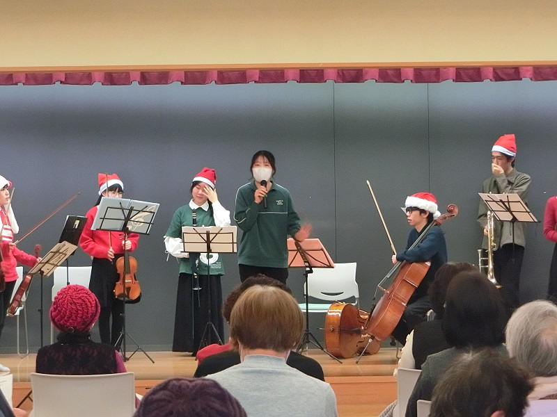 「本日はお招きいただきありがとうございます!クリスマスコンサートと題しまして、クリスマスの曲やディズニーの曲などを楽しめる内容となっています。次は『もみの木』『we wish a merry Cristmas』です。ぜひお聴きください」